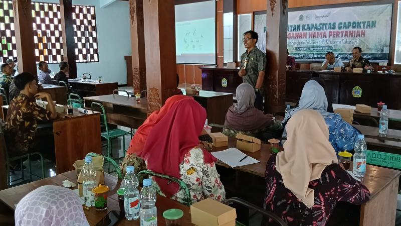 Lebih Lanjut disampaikan oleh Aprino Cahyo Abadi, SP, Pengendali Organisme Penganggu Tumbuhan (POPT) BPP Kapanewon Gedangsari, salah satu permasalahan terbesar disektor pertanian ini adalah hama penyakit. Ia menyampaikan pentingnya edukasi-edukasi tentang pengendalian hama penyakit ini disampaikan agar tidak salah dalam penanganannya.