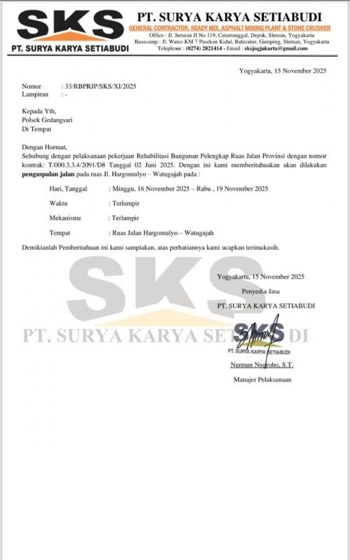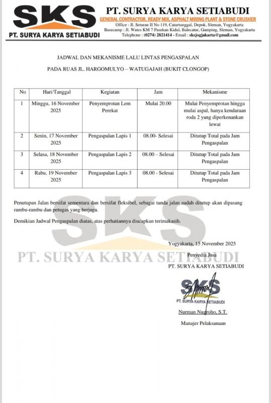 Dalam surat tersebut ditegaskan bahwasanya pengerjaan pengaspalan mayoritas akan dikerjakan siang hari dengan jam operasional dimulai pukul 08.00 WIB sampai dengan pekerjaan dihari tersebut dianggap cukup. Pada hari tersebut saat pekerjaan berlangsung, arus lalu lintas akan ditutup dan dialihkan melalui jalur lain.