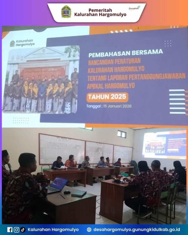 Hargomulyo—Pemerintah Kalurahan Hargomulyo melaksanakan Sidang Pertanggungjawaban Realisasi Anggaran Pendapatan dan Belanja Kalurahan (APBKal) Tahun Anggaran 2025, yang bertempat di Ruang Rapat Kalurahan Hargomulyo pada hari Kamis (15/1/2026). Agenda Sidang tersebut diikuti oleh Lurah Hargomulyo, Pamong Kalurahan yang terdiri dari Carik, Kasi Kaur beserta Staf, dan Badan Musyawarah Kalurahan (Bamuskal) Hargomulyo.