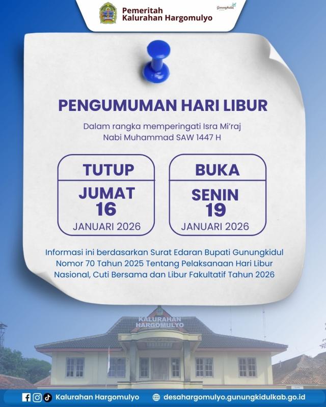 Pelayanan Kalurahan Hargomulyo pada hari Jumat, 16 Januari 2026 TUTUP.