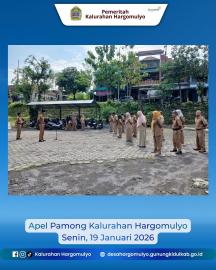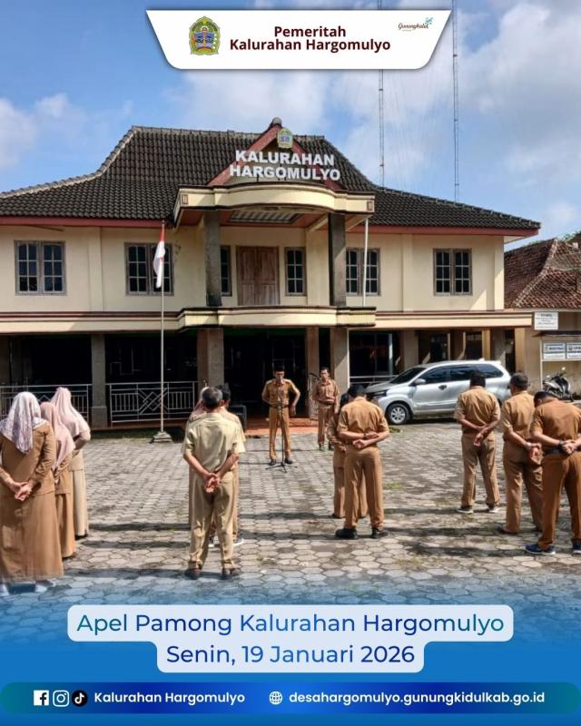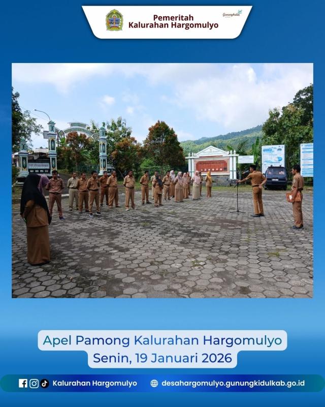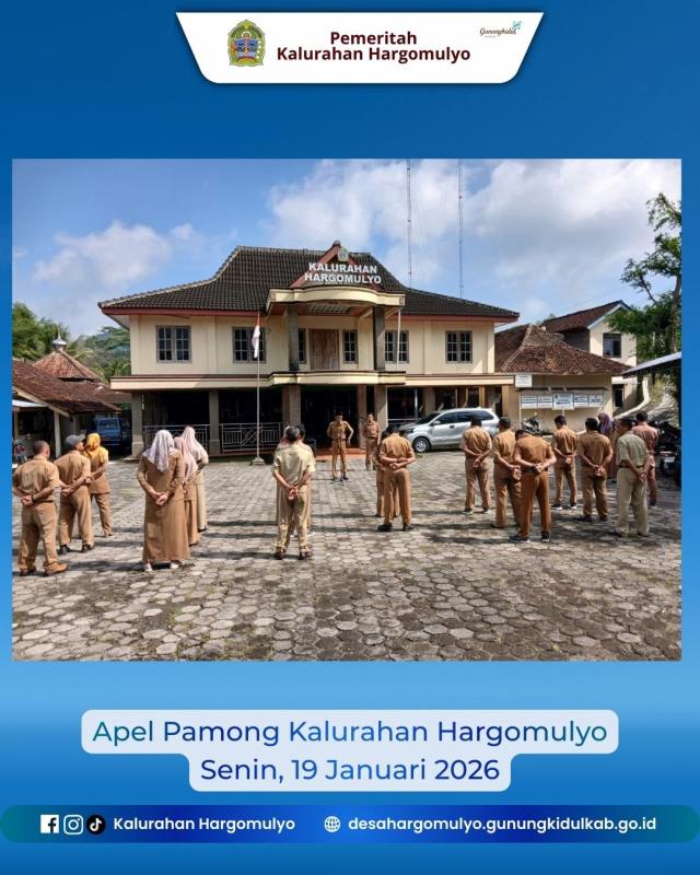 Hargomulyo—Apel pagi rutin Pamong Kalurahan Hargomulyo yang diikuti oleh seluruh Pamong Kalurahan Hargomulyo beserta Staf Pamong, pada hari Senin (19/1/2026) bertempat di Halaman Kantor Kalurahan Hargomulyo.