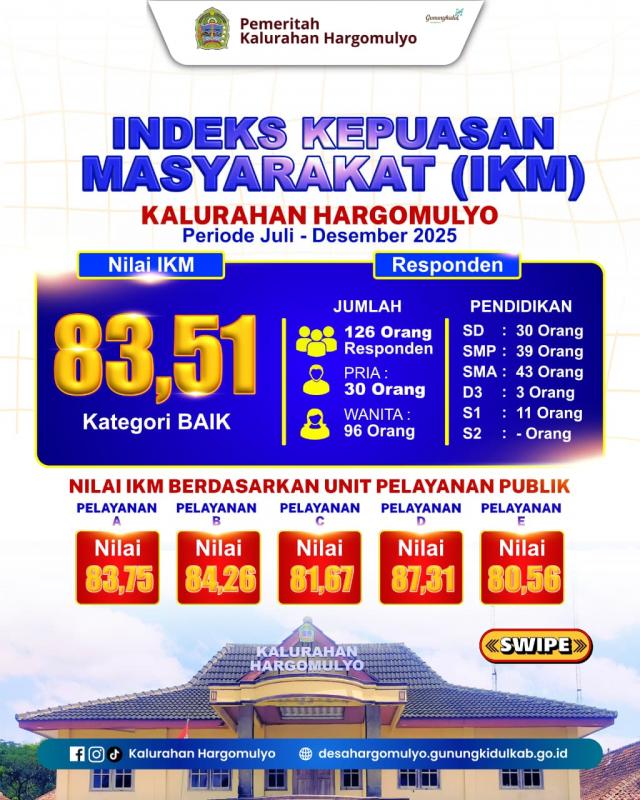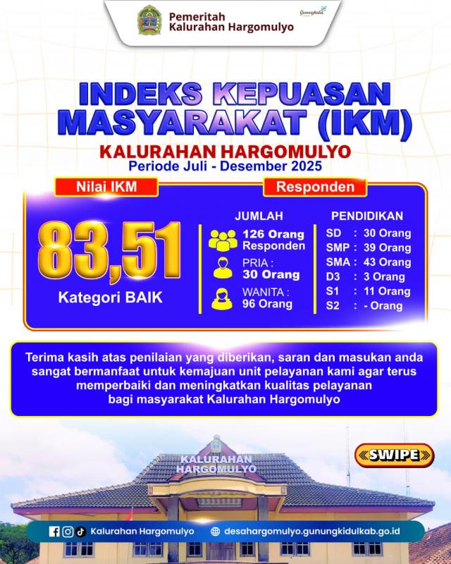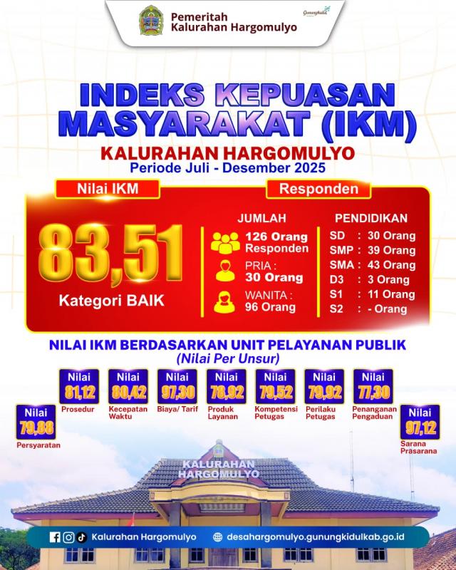 Indeks Kepuasan Masyarakat (IKM) Pelayanan Publik Kalurahan Hargomulyo periode Juli-Desember 2025 memperoleh nilai 83,51 dengan kategori Baik (B).