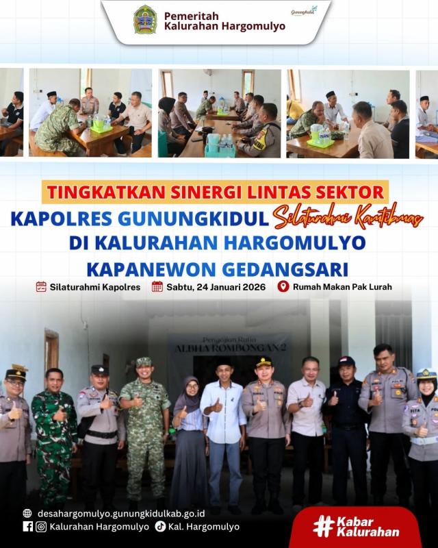 Sementara itu, Lurah Hargomulyo, Sumaryanta, S.A.P.,menyampaikan apresiasi atas silaturahmi Kapolres Gunungkidul beserta jajaran serta menyampaikan dukungan kepada kepolisian dalam menjaga kamtibmas serta membuka ruang komunikasi dan koordinasi dengan seluruh unsur masyarakat, termasuk Jaga Warga di wilayah Kalurahan Hargomulyo.