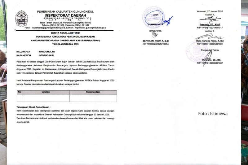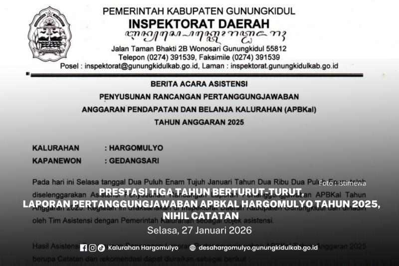 Carik Hargomulyo, Nanang Setyawan saat dimintai keterangan, membenarkan perihal tersebut. Dikonfirmasi olehnya, Pemkal Hargomulyo telah melakukan asistensi penyusunan Laporan Pertanggungjawaban APBKal Tahun 2025 bersama Inspektorat Daerah (Irda) Kabupaten Gunungkidul yang dijadwalkan pada Selasa (27/01/2026) pagi.
