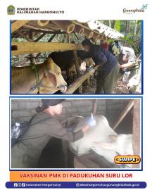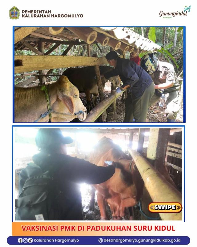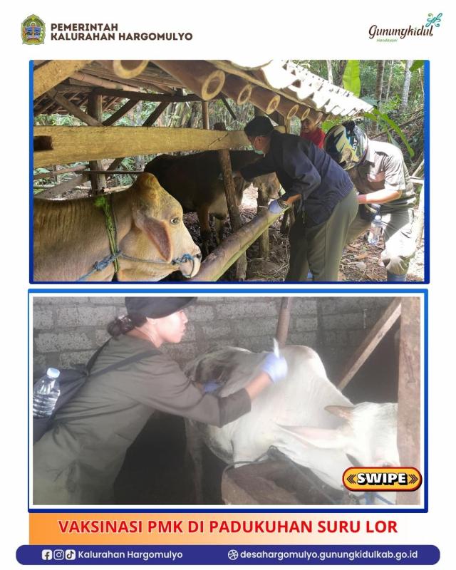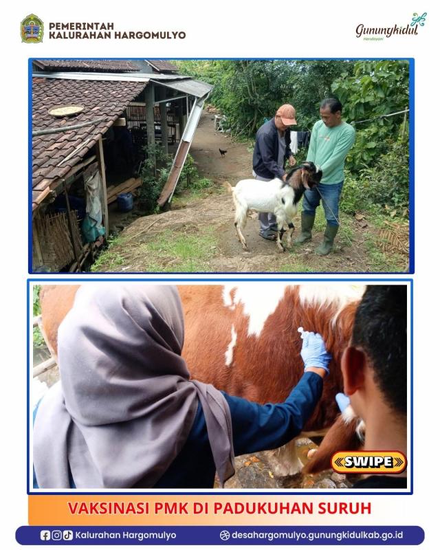 Kegiatan Vaksinasi Penyakit Mulut dan Kuku (PMK) serta pemberian vitamin gratis pada hewan ternak di wilayah Kalurahan Hargomulyo dimulai pada hari Senin tanggal 26 Januari sampai dengan tanggal 12 Februari 2026 di masing-masing Padukuhan.
