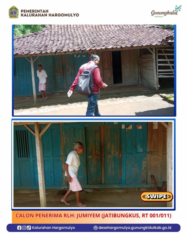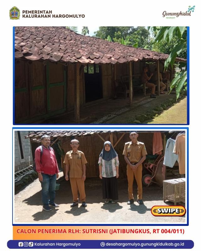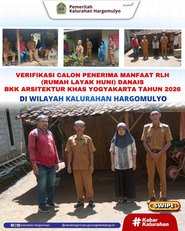 Lurah Hargomulyo, Ulu-ulu, Dukuh, bersama DPUESDM Provinsi Daerah Istimewa, Muhammad Akhirudin melakukan Verifikasi Calon Penerima RLH (Rumah Layak Huni) Danais BKK Arsitektur Khas Yogyakarta dengan mengunjungi langsung ke Lokasi calon penerima manfaat. Adapun calon Penerima Manfaat RLH Tahun 2026 di wilayah Kalurahan Hargomulyo antara lain, Wagini (Bulu RT 001/006), Jumiyem (Jatibungkus, RT 001/001), Sutrisni (Jatibungkus RT 004/011) dan Eni Kusrini (Suruh, RT 007/012).