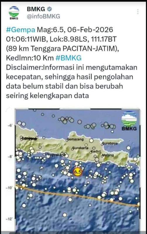 Berdasarkan informasi dari Badan Meteorologi, Klimatologi, dan Geofisika (BMKG), gempa terjadi pada pukul 01.06 WIB dengan kekuatan 6,5 SR. Pusat gempa berada di koordinat 8,98 Lintang Selatan dan 111,17 Bujur Timur, atau sekitar 89 kilometer tenggara Pacitan-JATIM dengan kedalaman 10 kilometer.