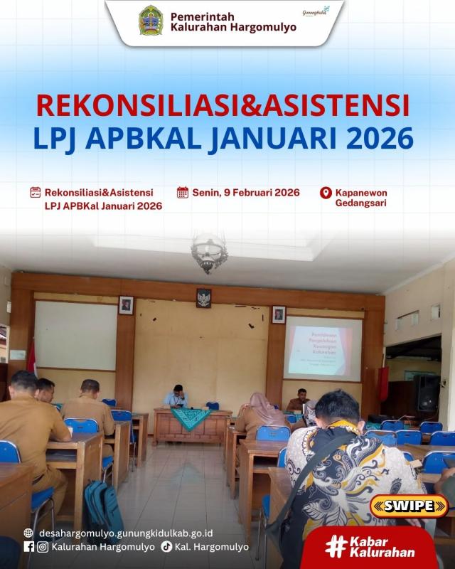 Hargomulyo— Carik Hargomulyo, Danarta dan Pangripta menghadiri agenda Rekonsiliasi dan Asistensi LPJ APBKal bulan Januari 2026 bertempat di Kapanewon Gedangsari, Senin (09/02/2026).