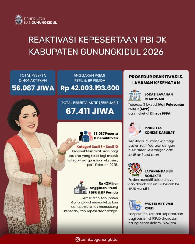 Pemerintah Kabupaten Gunungkidul melalui Dinas Sosial PPPA membuka layanan reaktivasi kepesertaan di Mall Pelayanan Publik (MPP) dan memberikan prioritas bagi masyarakat dengan kebutuhan layanan kesehatan rutin maupun darurat. Dukungan pembiayaan reaktivasi juga telah disiapkan melalui APBD Kabupaten Gunungkidul.