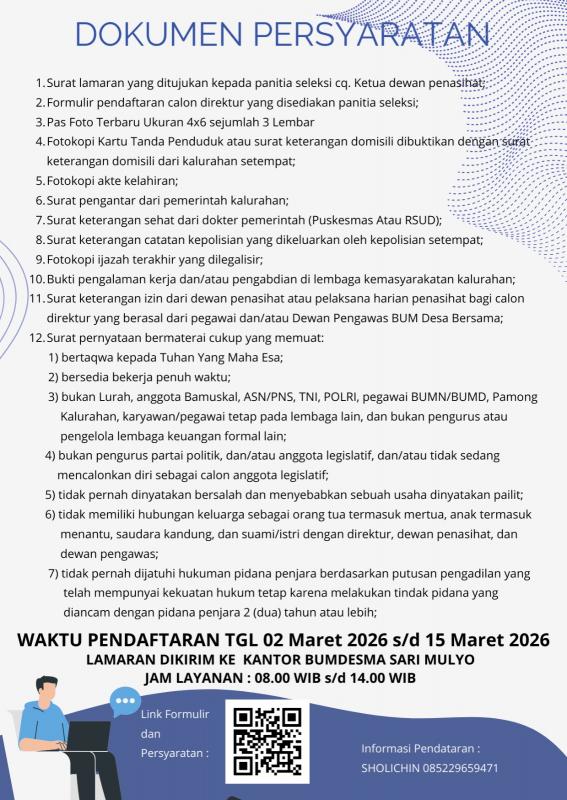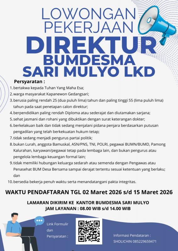 Informasi Lowongan Pekerjaan Direktur BUMDesMa Sarimulyo LKD Kapanewon Gedangsari.
