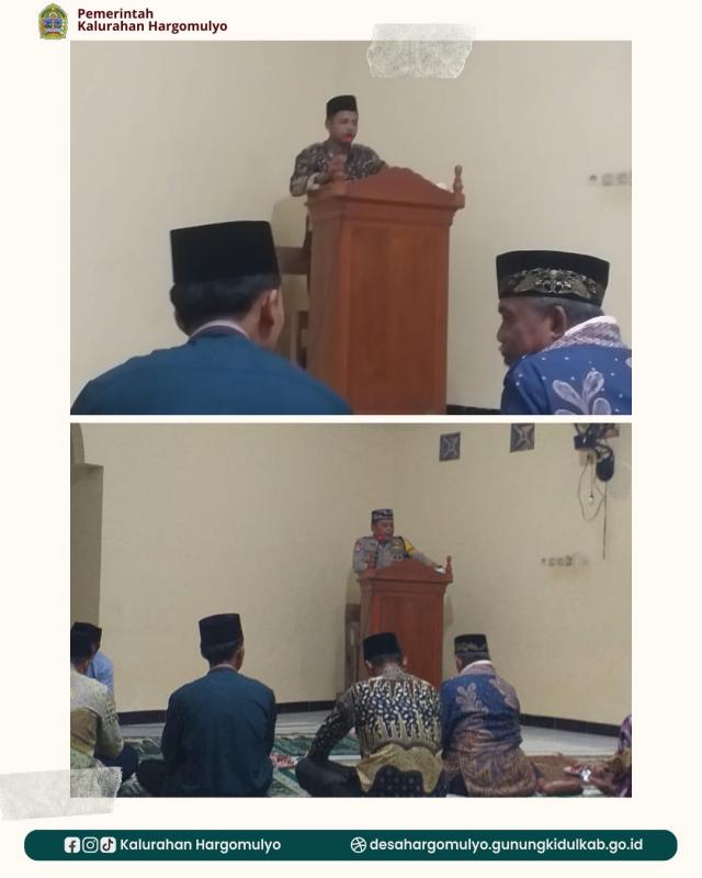 Pada kesempatan tersebut, sambutan dari Pemerintah Kalurahan Hargomulyo disampaikan oleh Nanang Setyawan selaku Carik Hargomulyo. Ia menyampaikan ucapan terimakasih kepada Takmir dan jamaah tarawih Masjid Darussalam yang telah menyambut hangat tim safari. Selain itu, ia juga menyampaikan terkait dengan kewajiban pembayaran pajak tanah sesuai dengan SPPT yang sudah dibagikan oleh Dukuh masing-masing dan himbauan untuk membangkitkan semangat gotong royong dalam kegiatan pembangunan Kalurahan mengingat terjadi penurunan anggaran dana desa tahun 2026.