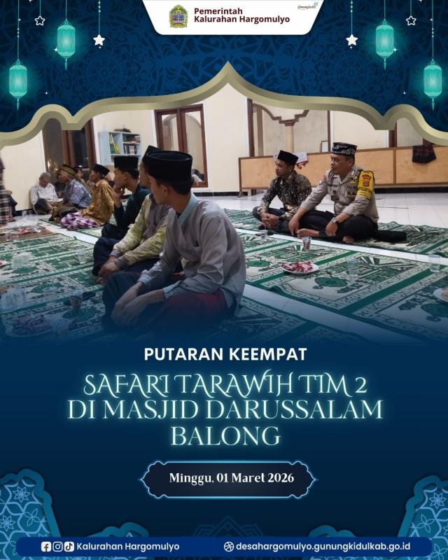 Hargomulyo – Tim Safari Tarawih Kelompok 2 melaksanakan safari Tarawih putaran keempat di Masjid Darussalam Balong pada Minggu malam (01/03/2026).