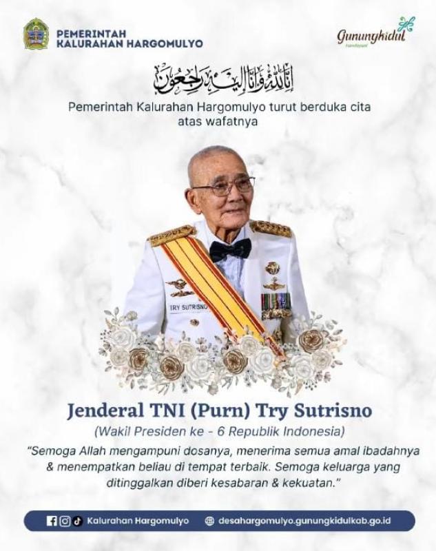 Segenap keluarga besar Pemerintah Kalurahan Hargomulyo menyampaikan dukacita yang mendalam atas wafatnya Jenderal TNI (Purn) Try Sutrisno, Wakil Presiden ke-6 Republik Indonesia.