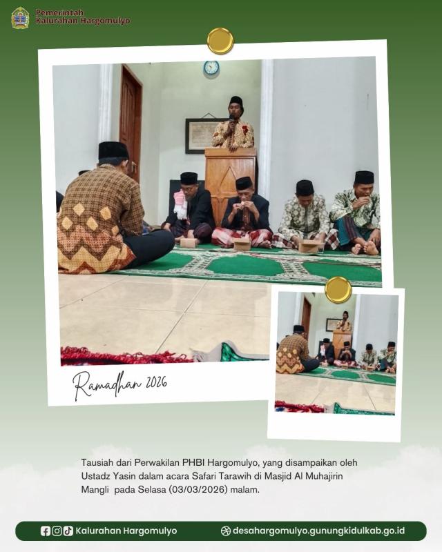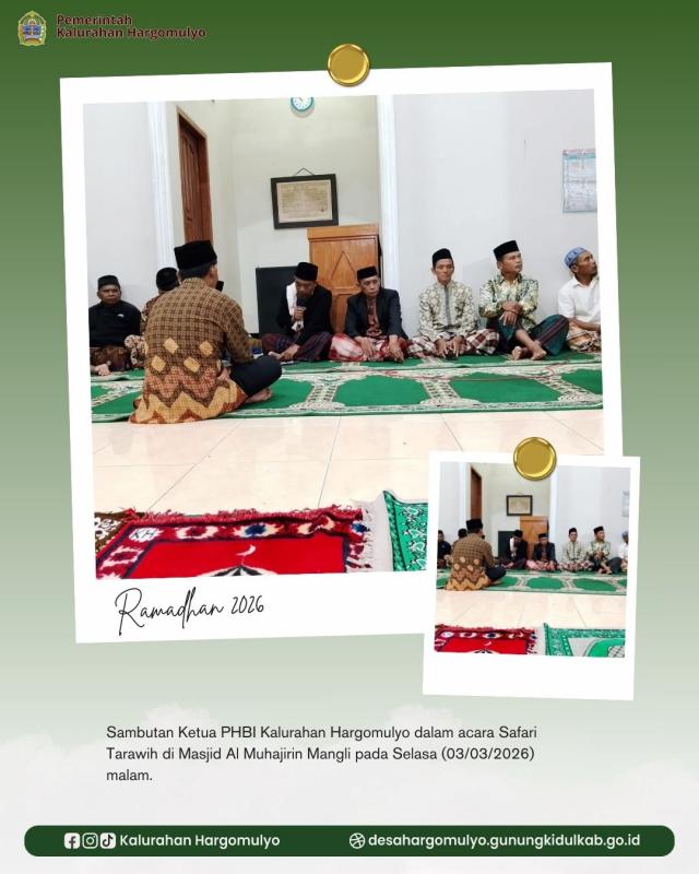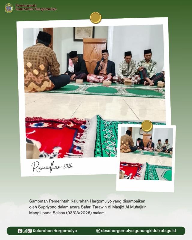 Pada kesempatan tersebut, sambutan dari Pemerintah Kalurahan Hargomulyo disampaikan oleh Supriyono selaku Danarta Hargomulyo. Ia menyampaikan ucapan terimakasih kepada Takmir dan jamaah tarawih Masjid Al Muhajirin yang telah menyambut hangat tim safari. Selain itu, ia juga menyampaikan terkait dengan kewajiban pembayaran pajak tanah sesuai dengan SPPT yang sudah dibagikan oleh Dukuh masing-masing dan himbauan untuk membangkitkan semangat gotong royong dalam kegiatan pembangunan Kalurahan mengingat terjadi penurunan anggaran dana desa tahun 2026.