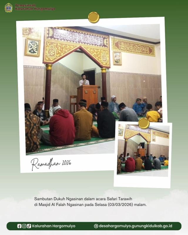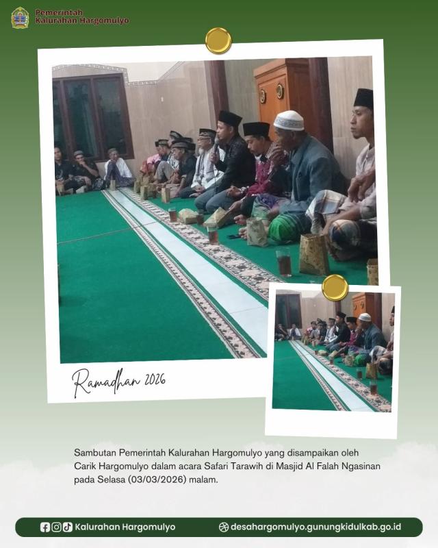 Pada kesempatan tersebut, sambutan dari Pemerintah Kalurahan Hargomulyo disampaikan oleh Nanang Setyawan selaku Carik Hargomulyo. Ia menyampaikan ucapan terimakasih kepada Takmir dan jamaah tarawih Masjid Al Falah yang telah menyambut hangat tim safari. Selain itu, ia juga menyampaikan terkait dengan kewajiban pembayaran pajak tanah sesuai dengan SPPT yang sudah dibagikan oleh Dukuh masing-masing dan himbauan untuk membangkitkan semangat gotong royong dalam kegiatan pembangunan Kalurahan mengingat terjadi penurunan anggaran dana desa tahun 2026.