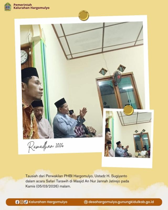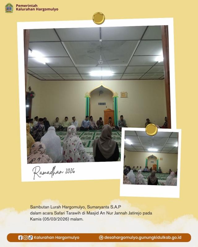 Pada kesempatan tersebut, sambutan dari Pemerintah Kalurahan Hargomulyo disampaikan oleh Lurah Hargomulyo sekaligus Koordinator Tim 3. Ia menyampaikan ucapan terimakasih kepada Takmir dan jamaah tarawih Masjid Nur Jannah yang telah menyambut hangat tim safari. Selain itu, ia juga menyampaikan terkait dengan kewajiban pembayaran pajak tanah sesuai dengan SPPT yang sudah dibagikan oleh Dukuh masing-masing dan himbauan untuk membangkitkan semangat gotong royong dalam kegiatan pembangunan Kalurahan mengingat terjadi penurunan anggaran dana desa tahun 2026.