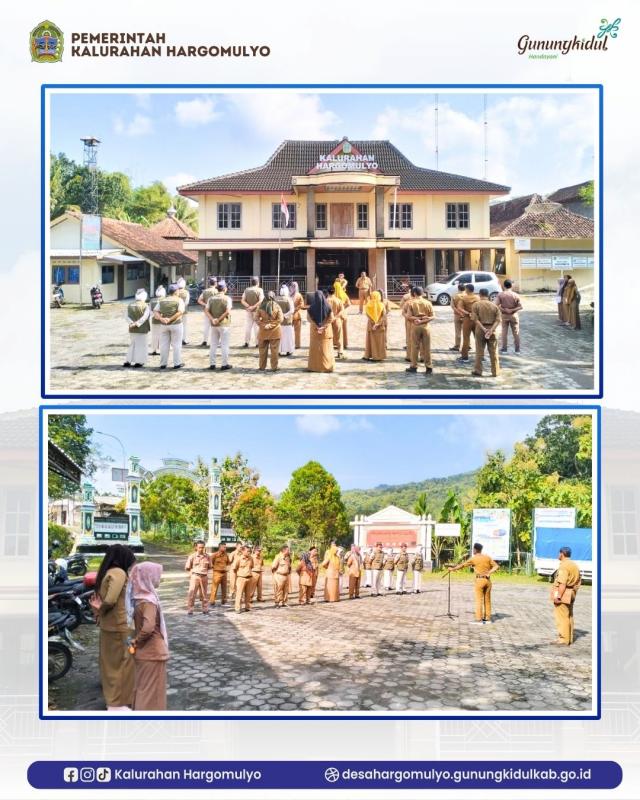 Apel pagi dipimpin langsung oleh Lurah Hargomulyo, Sumaryanta, S.A.P dan diikuti oleh seluruh pamong Kalurahan dan staf beserta mahasiswa KKN Sekolah Tinggi Ilmu Pertanahan Yogyakarta.