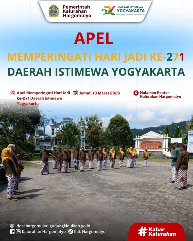 Apel memperingati Hari Jadi ke- 271 DIY dipimpin langsung oleh Lurah Hargomulyo, Sumaryanta, S.A.P dan diikuti oleh seluruh pamong Kalurahan beserta staf Pamong Kalurahan.