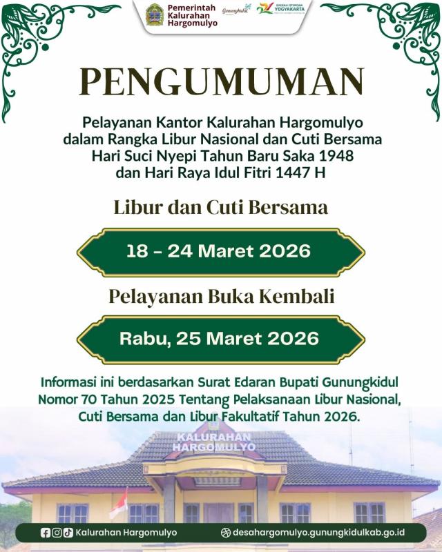 Pelayanan Kantor Kalurahan Hargomulyo dalam Rangka Libur Nasional dan Cuti Bersama Hari Suci Nyepi Tahun Baru Saka 1948 dan Hari Raya Idul Fitri 1447 H:
