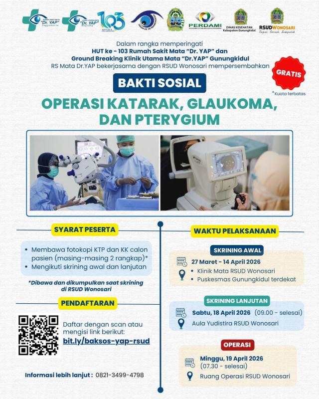 Memperingati Hari Ulang Tahun ke-103 Rumah Sakit Mata “Dr. YAP” dan Ground Breaking Pembangunan Klinik Utama Mata “Dr. YAP” Gunungkidul, Rumah Sakit Mata “Dr. YAP”berkolaborasi dengan RSUD Wonosari menyelenggarakan “Bakti Sosial Operasi Katarak, Glaukoma, dan Pterygium” GRATIS dengan acara sebagai berikut: