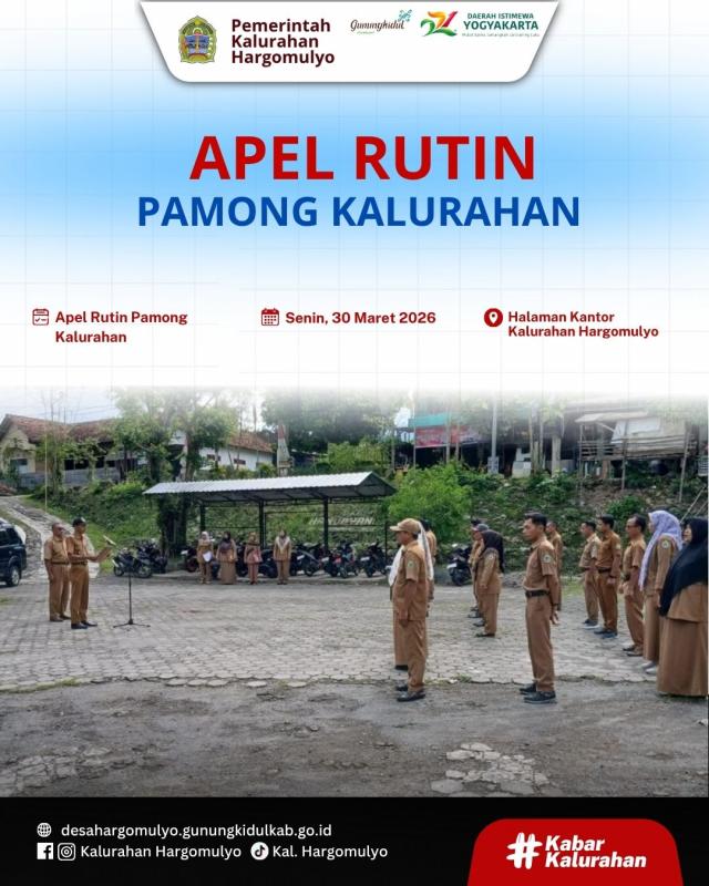 Apel pagi dipimpin oleh Lurah Hargomulyo dan diikuti oleh seluruh pamong Kalurahan beserta Staf Pamong Kalurahan Hargomulyo.